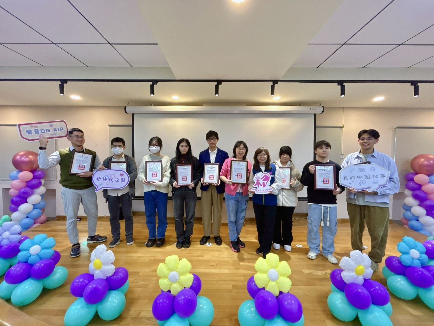 成果發表會以年度回顧影片揭開序幕,呈現學員課堂投入、主題思考與聲音表現的進步軌跡。現場依創意呈現、跨文化交流與敘事深度三大指標,頒發九項特色精神獎座,鼓勵每位學員的努力與突破。